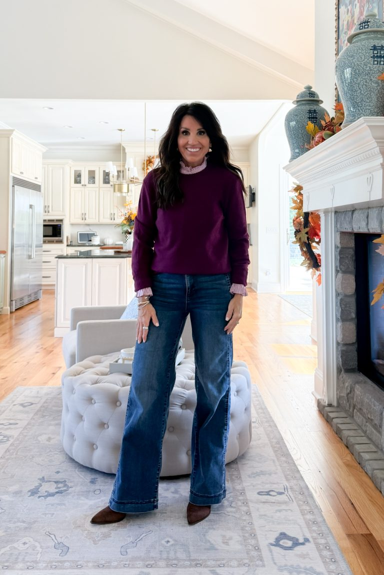 I really like the colour of this plum sweater, particularly paired with this ruffleneck button up. This glance jogs my memory that now and again the most straightforward outfit combos are the most efficient. A shirt, a sweater, and denims can take you on the subject of anyplace.