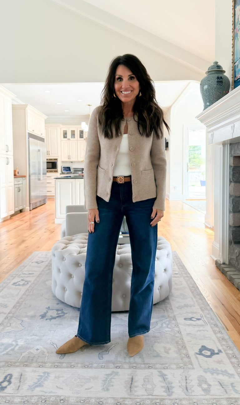 Cashmere Structured Cardigan (XS) | Tank Best (medium) | Comfy Directly Leg Denim (27, 28 inseam) | Belt | Earrings | Brown Mule