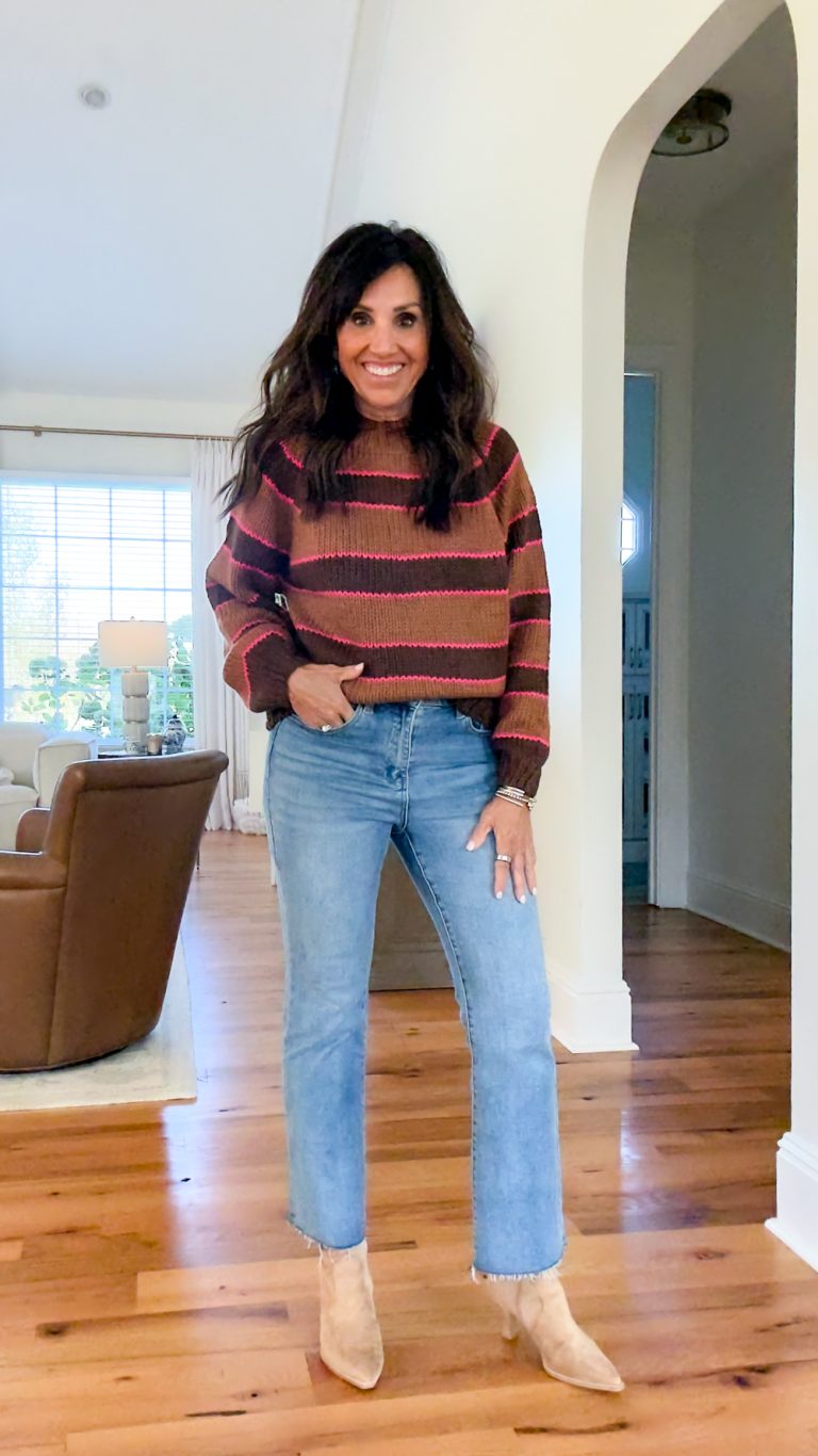 This striped sweater is any such a laugh approach so as to add a bit of colour and trend in your fall dresser. The combination of heat brown and purple stripes feels playful but vintage, and the comfortable have compatibility makes it simple to put on. I paired it with straight-leg denims and booties for a easy, on a regular basis glance that’s comfy however nonetheless seems to be put-together. This might be a really perfect outfit for a laid-back Thanksgiving collecting or informal Friday on the place of work.
