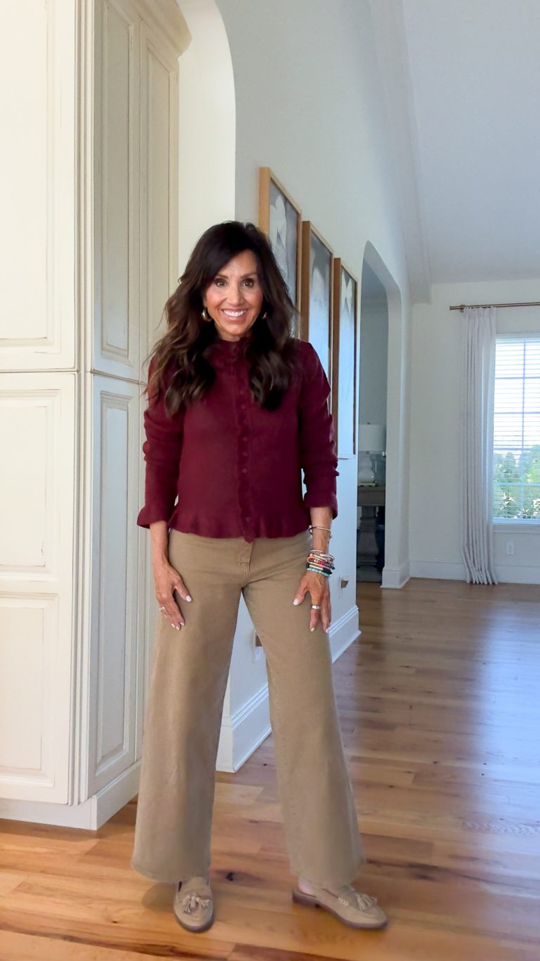 I really like how this outfit got here collectively. This reasonably priced burgundy cardigan has such lovely main points alongside the hem and sleeves, giving it a female contact with out feeling fussy. I paired it with tan wide-leg pants, one among my favourite colour combos for fall. It’s a very simple, pulled-together glance that works for absolutely anything to your calendar.