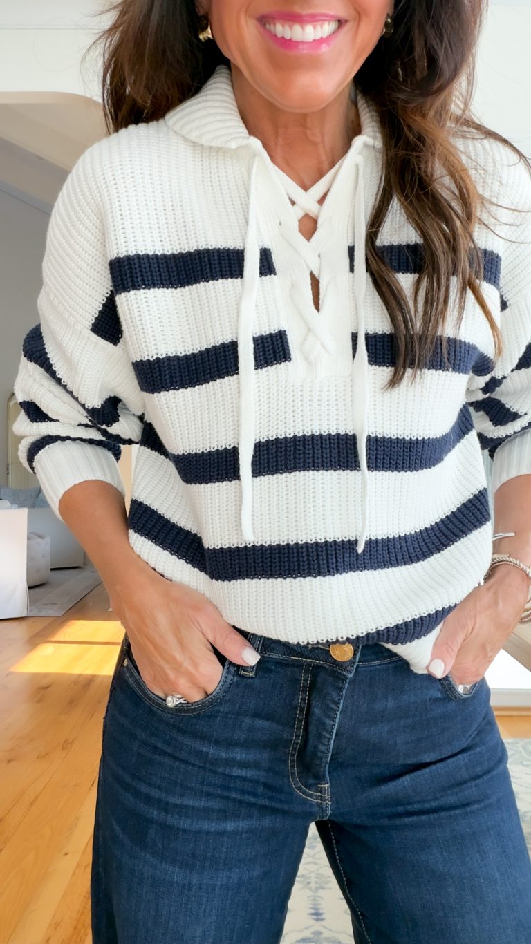 I really like the military and white stripe, it’s undying and feels nautical, which all the time alerts spring to me. The lace-up collar element provides simply sufficient hobby with out being excessive. It’s modest, female, and flattering.