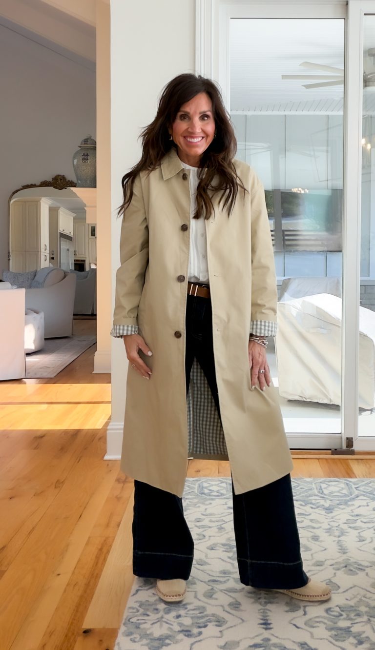 Trench Coat (XS) | Shirt (small) | Darkish Denim (dimension 2) | Earrings | Belt | Walmart Shoe (an alternative choice right here)