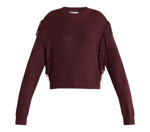 - Date Night time: Burgundy fringe sweater + black denims + heeled boots