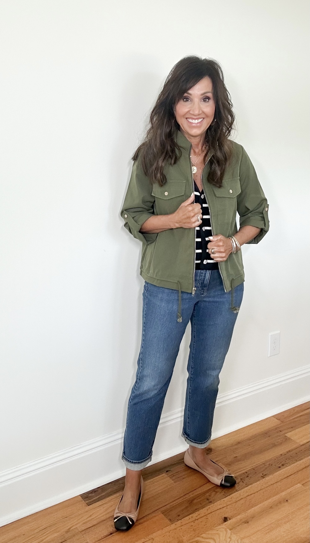 This olive inexperienced jacket is best possible for the ones in-between days when it’s nonetheless heat out of doors however you’re able to begin dressing for fall. It’s light-weight but provides your outfit that layered glance all of us love this time of yr. I paired it with a striped vest, denims, and my favourite residences for a very simple outfit that works for absolutely anything on my calendar.