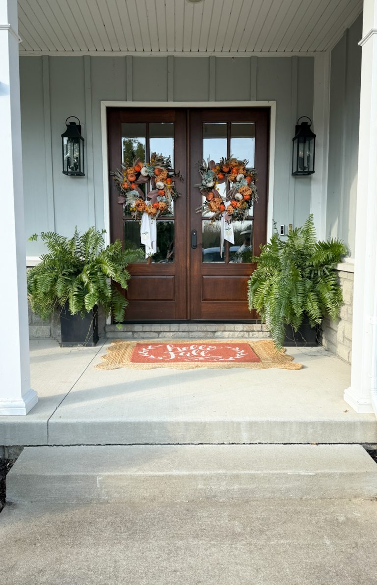 That is my entrance porch AFTER. In fact, no fall porch is entire with out wreaths. We added two huge, harvest-inspired wreaths to our double doorways. Those wreaths are stuffed with pretend florals, pumpkins, and leafy stems.