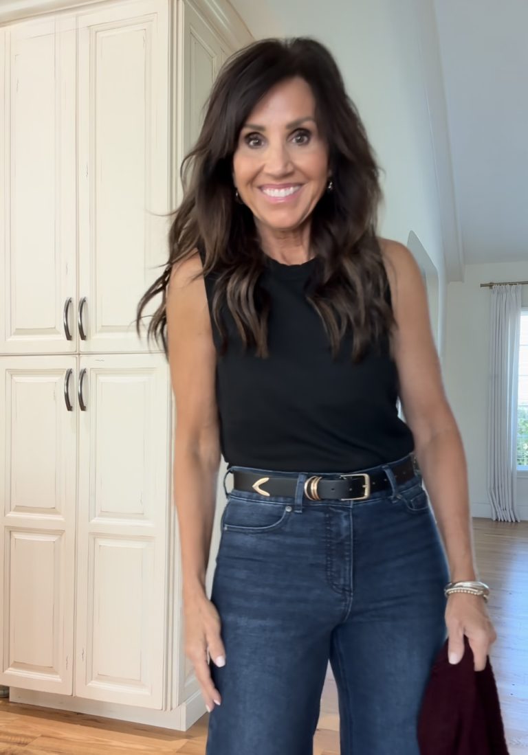 Sweater Tank (small) | Denim (measurement 4) | Belt (25-30) | Earrings