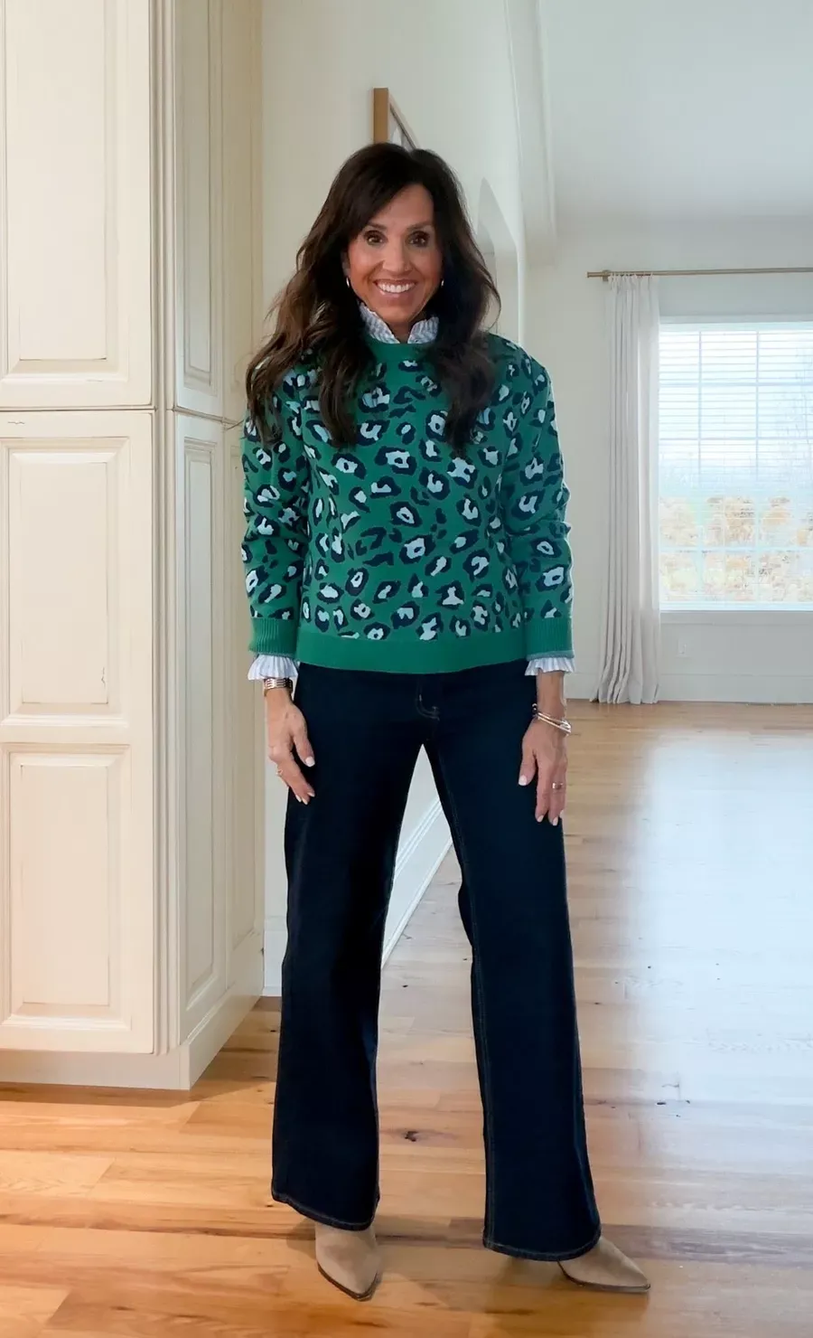I really like this darling inexperienced leopard sweater. I layered it over a striped button-down for slightly further hobby, and matched it with darkish denim and boots. It’s colourful with out feeling too loud, and very best for wintry weather days when you need one thing other!