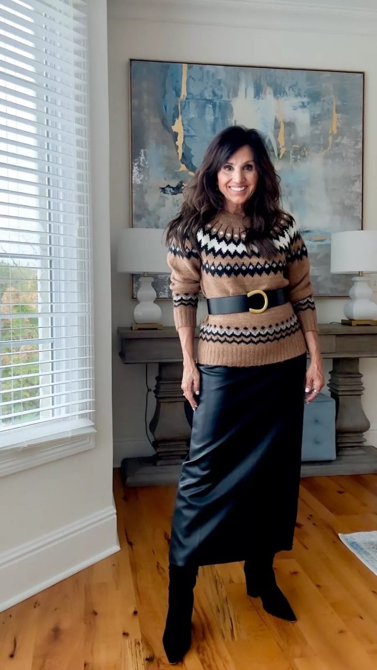 I’ve at all times liked a Honest Isle sweater, and this one is this kind of a laugh technique to combine texture and development. The cushy camel colour feels comfortable for the season, and I added a large black belt to outline the waist and provides it a bit of construction. The fake leather-based skirt provides a pleasing distinction and makes the outfit really feel present with out being overdone. I stopped the glance with tall black boots that stay the outfit blank and vintage.