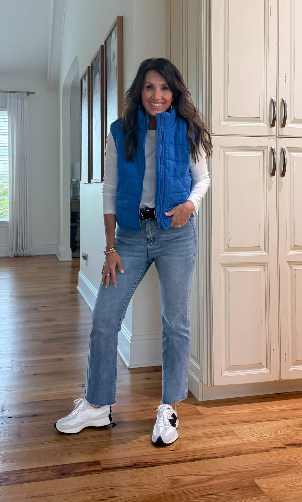 I styled it with my favourite white lengthy sleeve tee and straight-leg denims, then added those New Stability 327 footwear to stay issues informal. The blue actually pops in opposition to denim and offers the entire outfit a recent, sporty vibe.