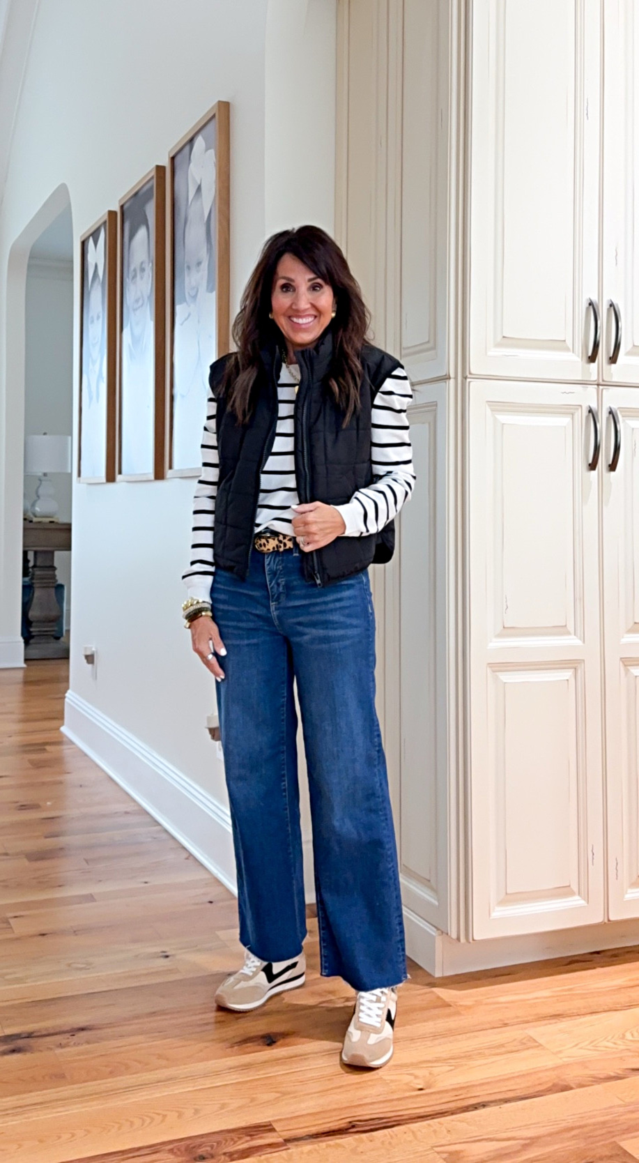 The black vest is a kind of items you’ll achieve for over and over as a result of it really works with nearly anything else you pair it with. I particularly adore it with the stripes as it feels undying and provides simply the correct amount of distinction.