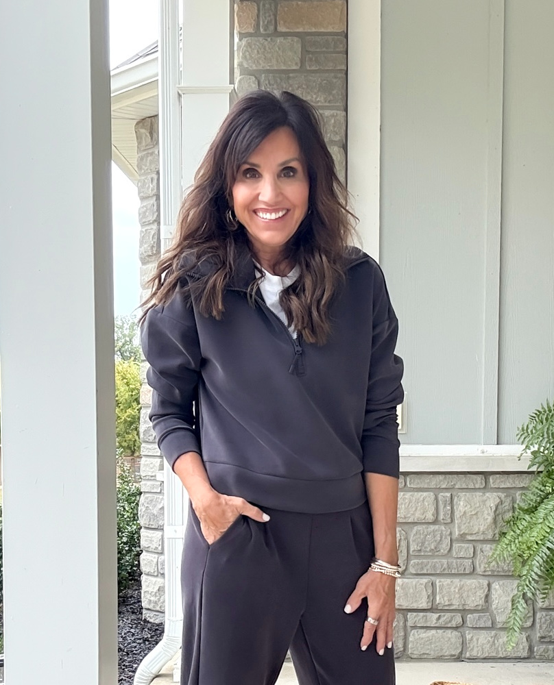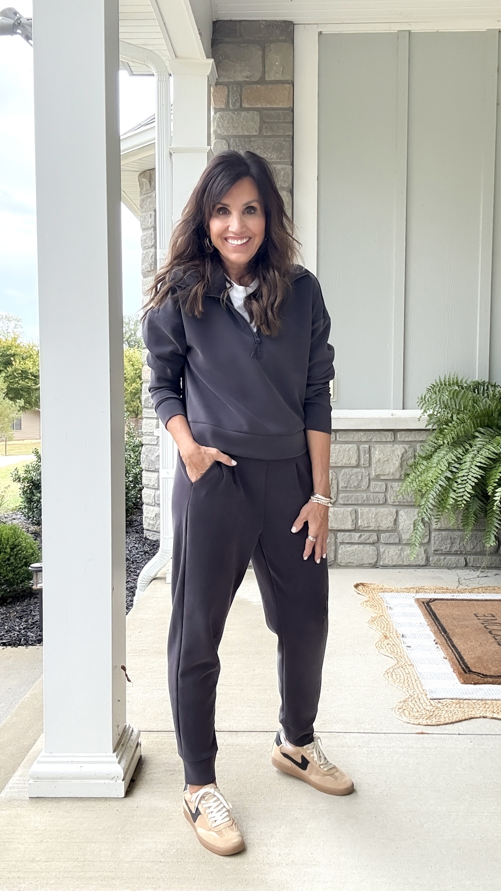 This scuba knit quarter zip is a type of throw-on items you’ll succeed in for over and over. It really works completely with the matching joggers or tossed on with denims for a very simple weekend outfit!