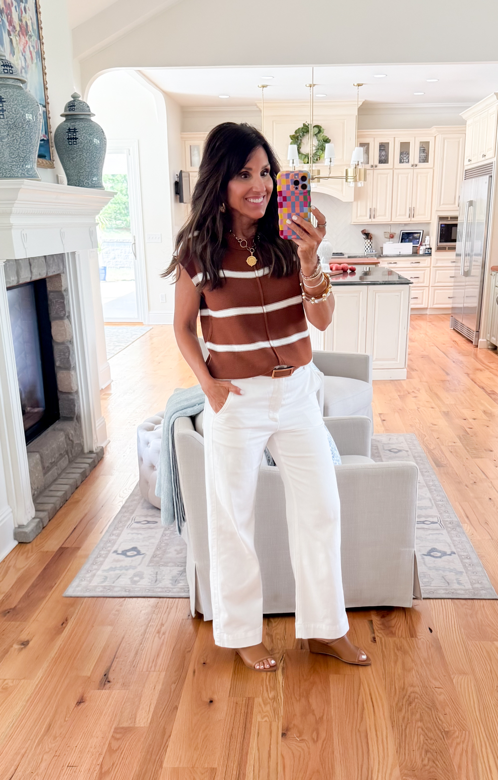 Brown and White Striped Best (small) | White Trousers (offered out, an identical pair right here) | Wedge Heel | Earrings | Necklace | Bracelet | Belt