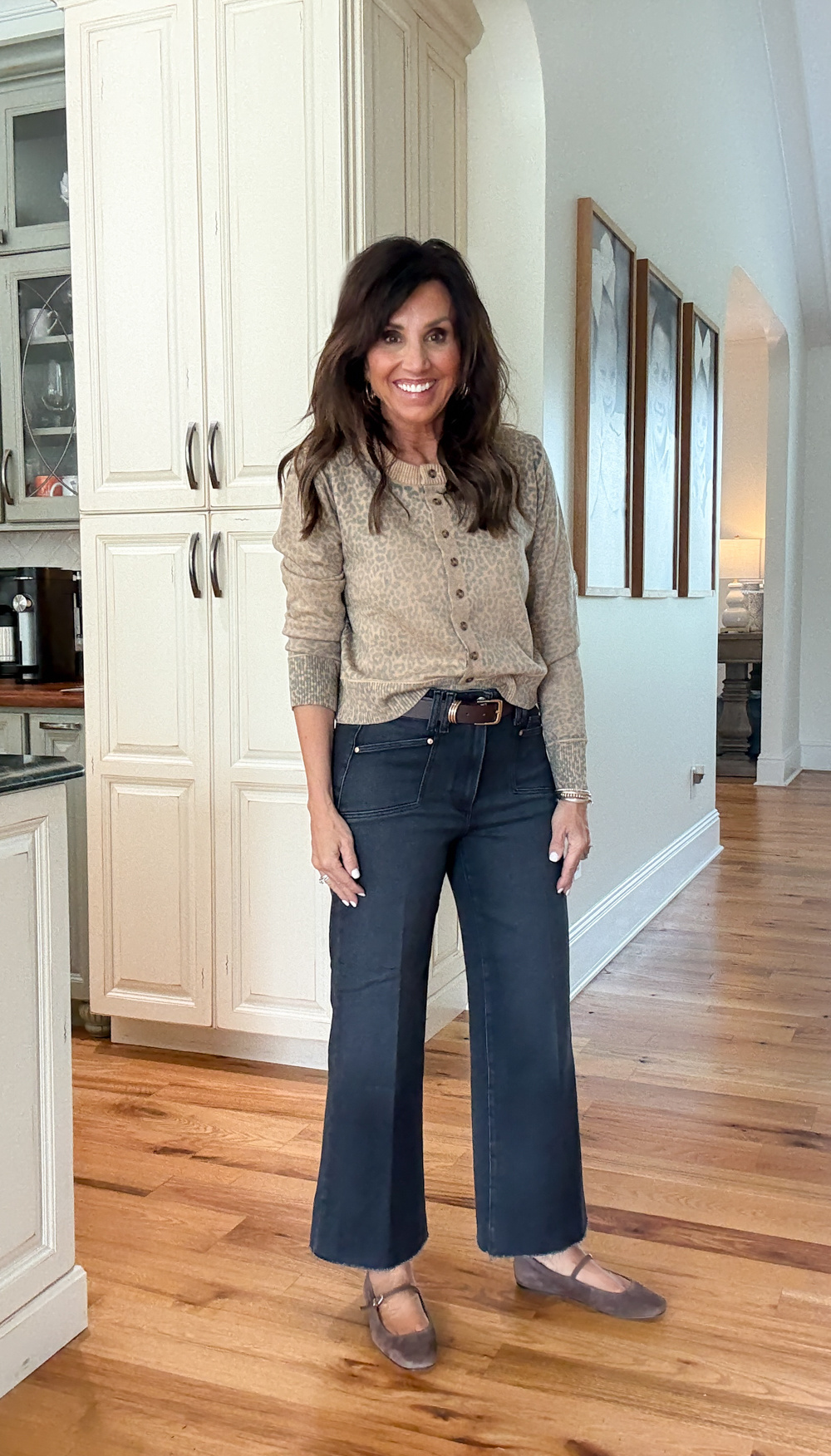 Darkish Brown Cardigan (small) | Extensive Leg Denims (27) | Belt | Ballet Apartments (possibility right here) | Earrings
