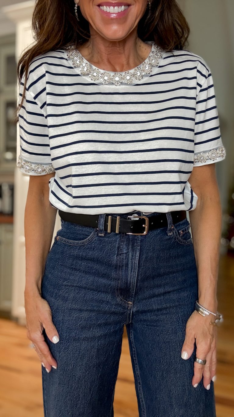 This adorned tee from J.Staff Manufacturing unit is this sort of candy mix of informal and festive. The vintage navy-and-white stripes give it that undying, nautical really feel, however the jeweled neckline and sleeves upload simply the correct amount of sparkle for the season.