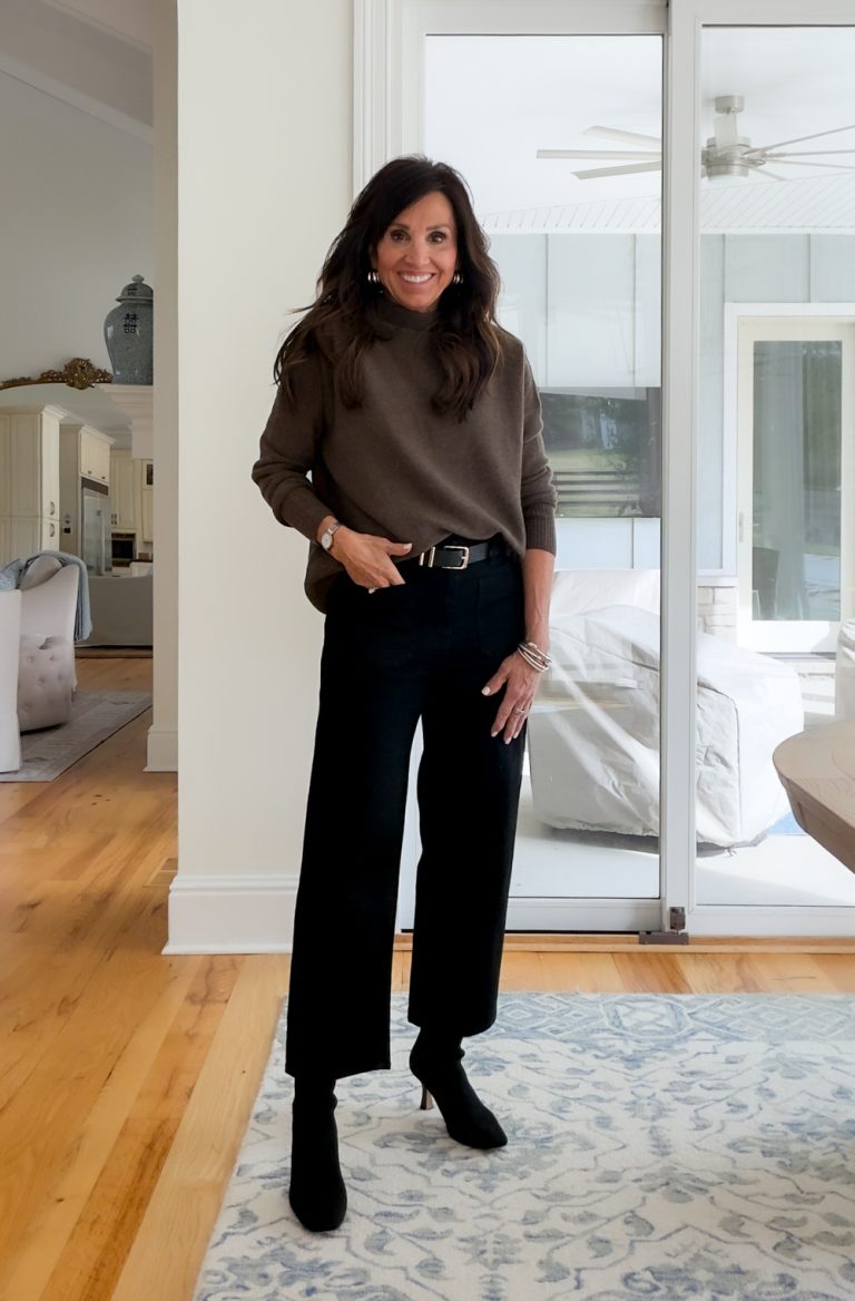 I really like a just right turtleneck sweater, and this glance feels trendy but vintage. It’s a very easy outfit for the entirety from an informal assembly to dinner out, and it transitions smartly from day to night time.