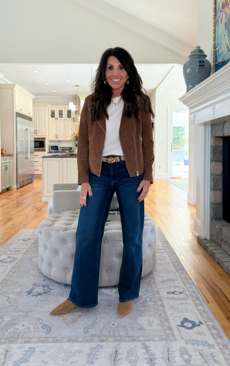 Suede Biker Jacket (small) | Crewneck Sweater (small) | At ease Directly Leg Denim (27, 28 inseam) | Leopard Belt | Earrings | Necklace | Bracelets | Brown Mule