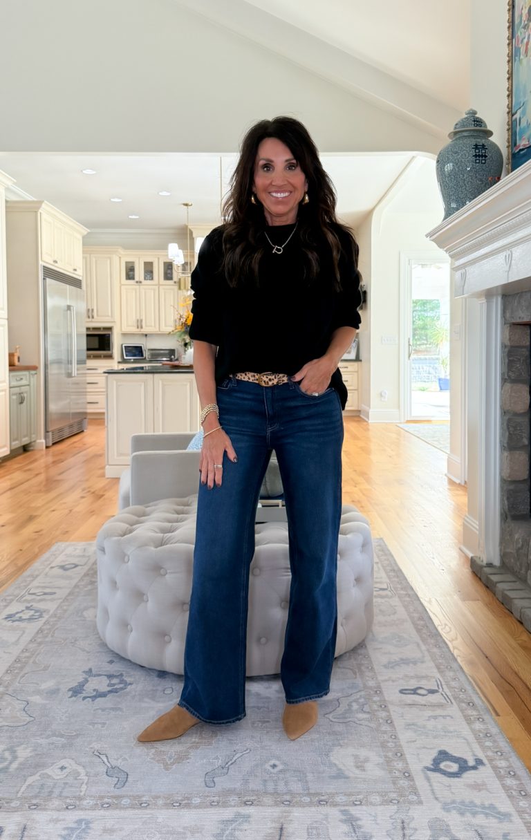 Crewneck Sweater (small) | At ease Directly Leg Denim (27, 28 inseam) | Leopard Belt | Earrings | Necklace | Bracelets | Brown Mule