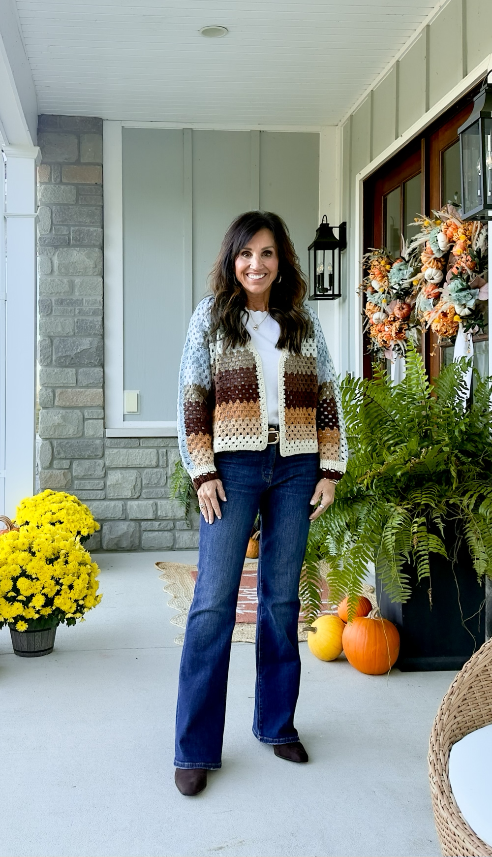 This outfit feels so comfy and festive for Thanksgiving. The crochet cardigan provides a a laugh pop of colour and texture, and I really like the way it pairs with a easy white tee and darkish denims. It’s a kind of outfits that’s at ease sufficient for the kitchen however nonetheless adorable for circle of relatives footage.