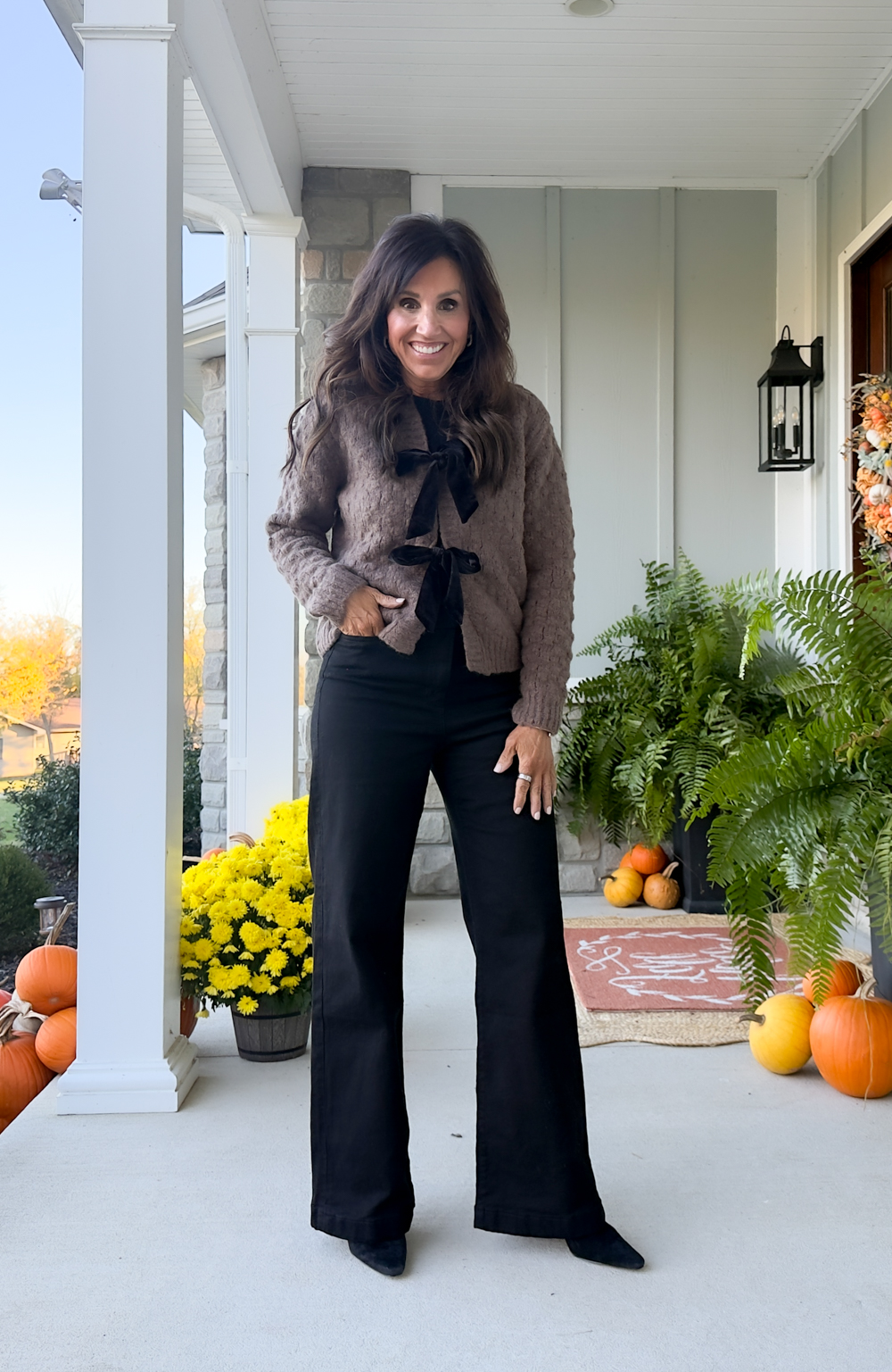 This outfit moves the easiest steadiness between comfy and polished. The cushy, textured brown sweater with its captivating velvet bow ties provides a female contact that feels festive but at ease. Paired with vast leg black denims and pointed-toe boots, the glance remains vintage and flattering. The nice and cozy tones have compatibility superbly with the autumn season, and the whole taste feels without problems put-together.