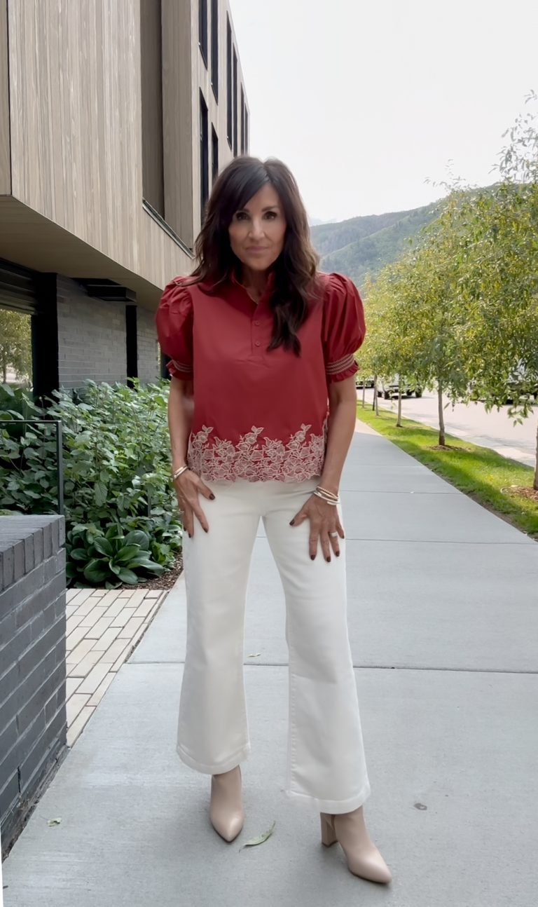 I really like this pretty embroidered shirt! I paired it with those Kimberly Denims and white booties.