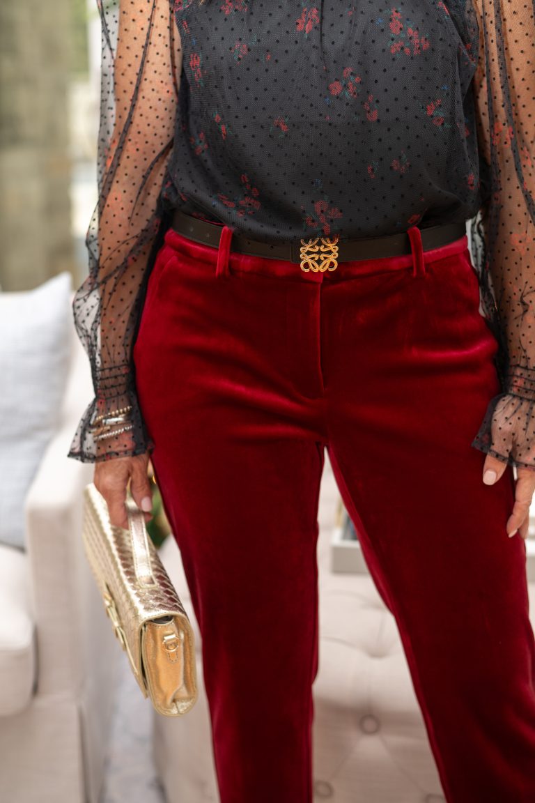 Velvet Dot Tulle Floral Cami Shirt (small) | Riviera Narrow Pants in Velvet (dimension 4) | Earrings (CYNDI20) | Belt | Gold Grasp | Black Booties